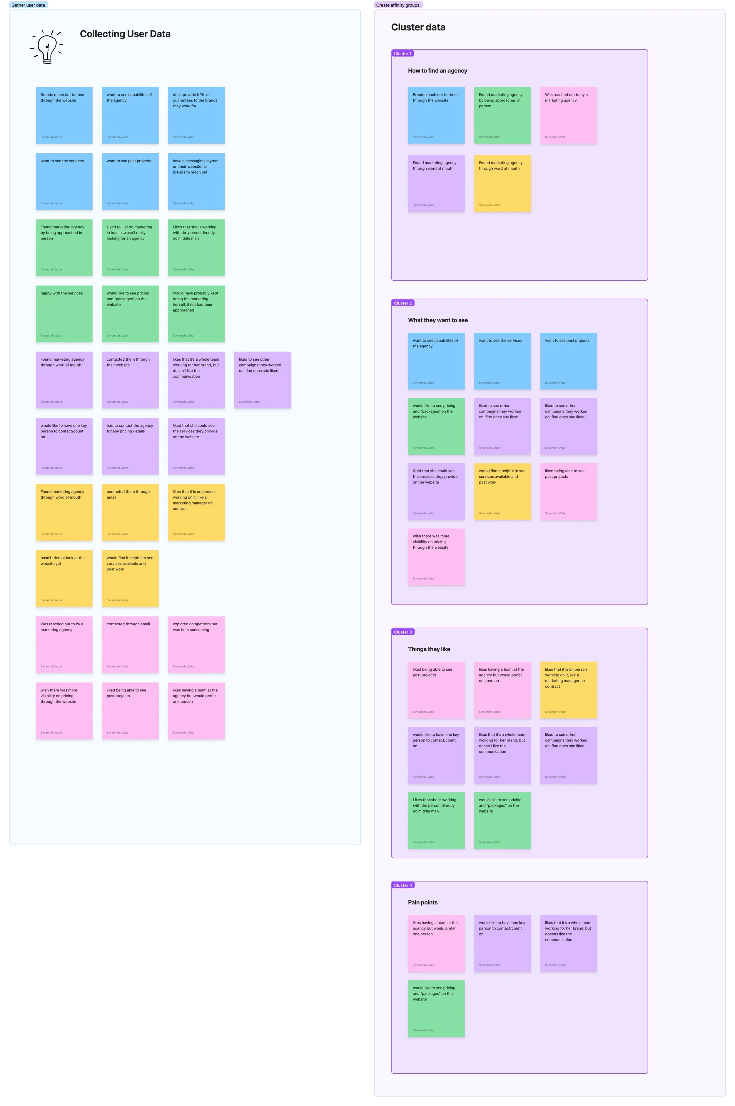 I conducted user interviews with five participants where it was revealed that businesses face challenges when selecting a marketing agency due to the overwhelming number of options and limited transparency in pricing, often needing to reach out for rate information. Participants expressed a desire for more trust, clearer visibility of services, rates, and past projects on agency websites. Additionally, while some prefer the comprehensive approach of a full team, many find working with a single point of contact more personable and effective.